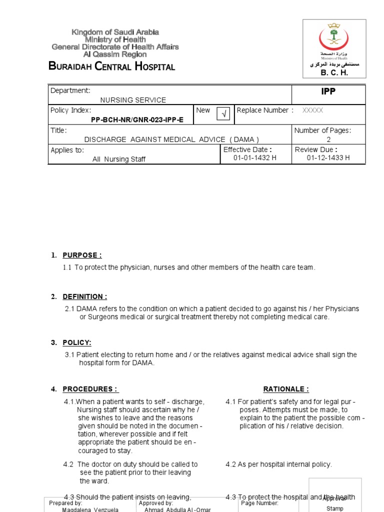 Background. Against medical advice forms are documents which are provided to patients who either wants to decline the suggestions of a doctor or leave his hospital bed. Download or preview 4 pages of pdf version of against medical advice (ama)/ release (doc: