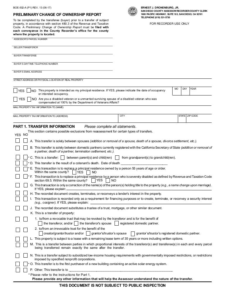 Owners of any property that has had changed in ownership (except by death of an owner) must file a preliminary change in ownership report in those cases where no deed is recorded, california law requires property owners to file a change of ownership statement (see forms/attachments tab).