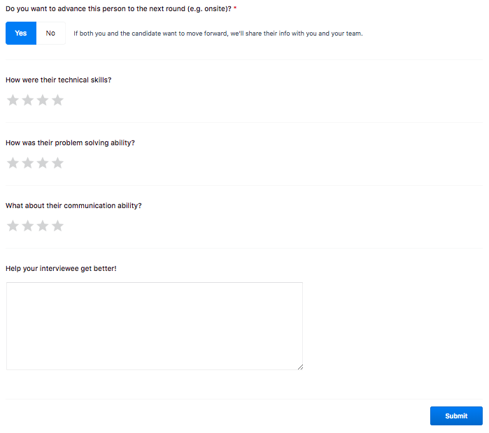 The more complex your form, the less likely you are to get any feedback at all. A feedback form is a tool used to gather insights and relevant information about people's thoughts on an issue to gain some improvement. An interview feedback template is a form that's created for interviewer(s) to fill out during the interview process, usually after interviewing a candidate for a specific position.
