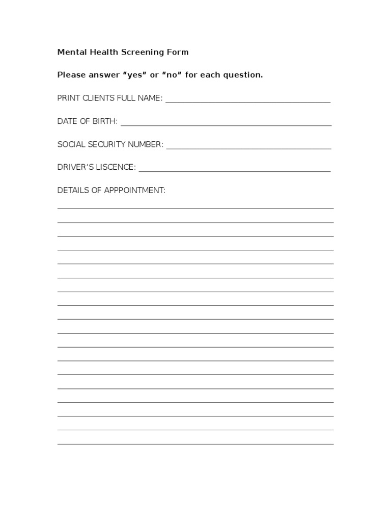 Pics. This mental health screening form may be used by psychiatrists and psychologists or mental health institutions. You may need a mental health screening if you have symptoms of a mental disorder.