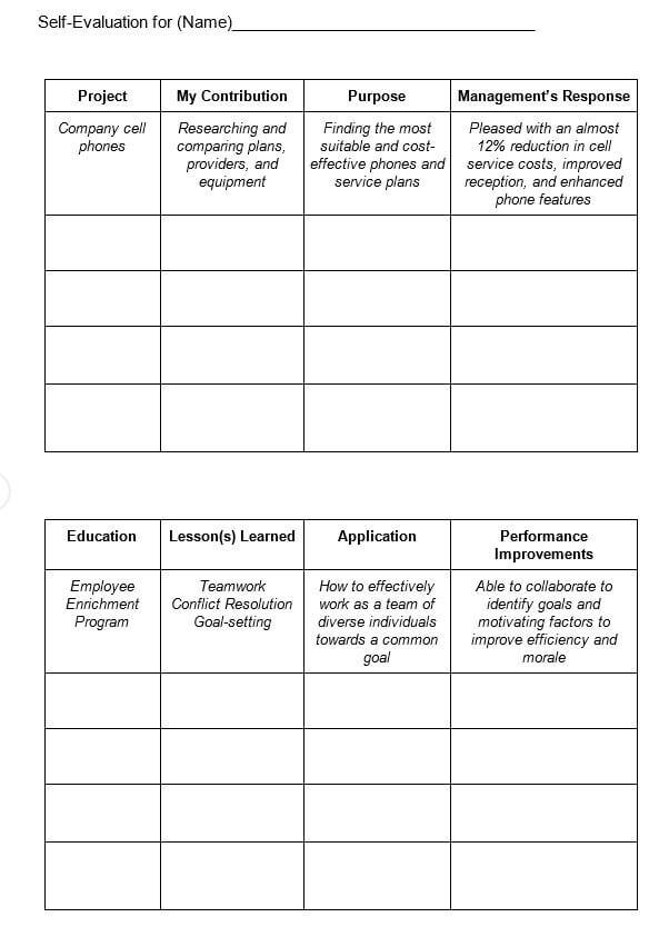 Here are two examples of review forms for salaried employees. Employees can either fill in a self evaluation form or take a look at previously made self evaluation samples to serve as reference for their own. After a year of working for your company, you can use this form to evaluate your performance.