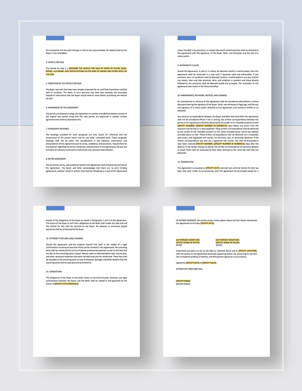 Images. This is a contract made between the seller, insert name of seller, and the buyer, insert name of buyer, for the sale of seller's insert year, make, and model of vehicle. Using this agreement, the buyer and seller can outline the terms and conditions of the sale and describe the vehicle that is being sold.